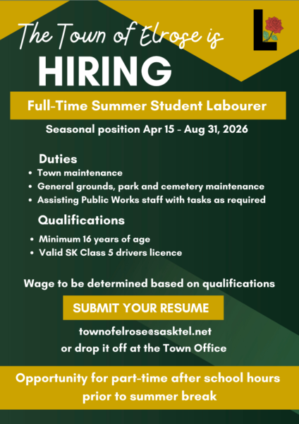Please submit resumes to the Town of Elrose – Town Office