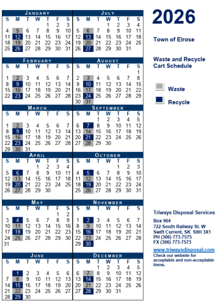 Listed below are the sizes of the commercial business garbage bins being provided by TriWays Disposal Services Ltd., the service frequency, and the monthly prices that will be charged to the business on their Town of Elrose utility invoices. This cost includes continued access to the 30 yard Recycle bins located at the end of Main Street.
